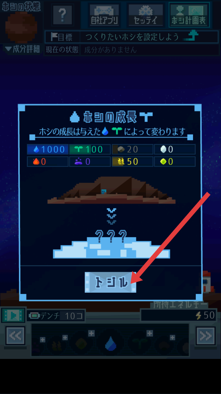 2、在自己星球的成长界面,点击【トジル】按钮,确认或启动当前星球成长的属性设定与变化。