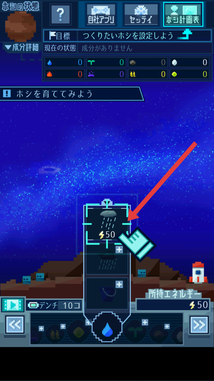 3、需要根据游戏的提示,点击消耗【50能量】的降雨图标,运用能量改变星球环境,助力星球发展。