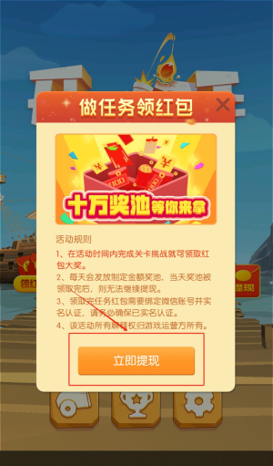 1、参与“做任务领红包”活动,完成指定关卡挑战即可领取红包奖励,绑定微信并实名认证后可提现至账户。