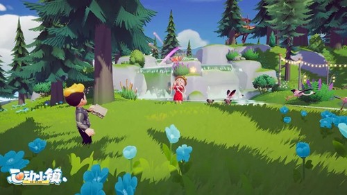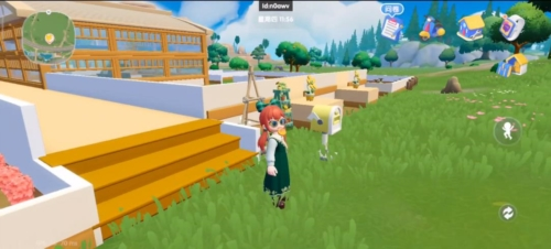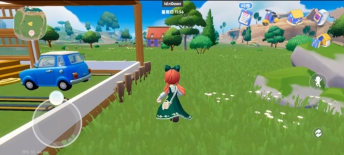 2、在草地场景,沿道路探索,留意蓝色小车等互动点,靠近触发交互,了解小镇设施功能,推进探索。