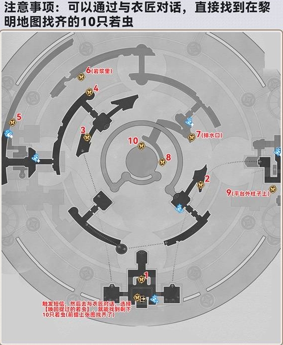 1、与衣匠对话后,按图中1-10标记位置(如1在底部区域、2在右侧建筑旁等)找齐10只若虫,留意场景内的建筑标识(若菜里、排水口等)辅助定位。