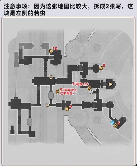 2、按图中5、6、7、8、9、10标记收集,其中7需调查3次、9需利用回滑浮块机制,跟随路线探索各点位。