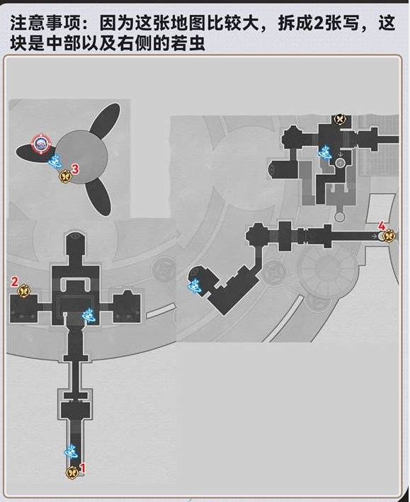 3、中右侧区域拆分:覆盖1、2、3、4号若虫,分布于中央建筑、外侧通道,结合传送、机关解密(浮块、调查点)完成收集。