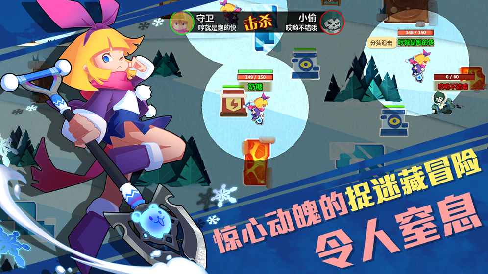 1、选“守卫”英雄(红箭头),进入“捉迷藏冒险”,利用地形(雪地草丛),躲避追捕,完成存活任务,积累积分。