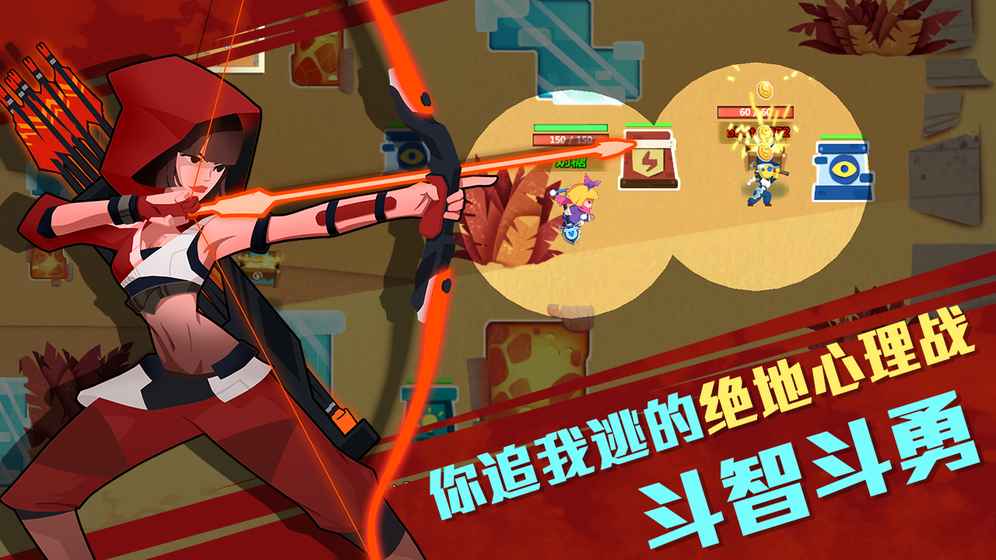 2、用“射手”角色(红箭头),参与“绝地心理战”,预判敌人路径,远程狙击,配合队友包夹,击败对手,推进战局。