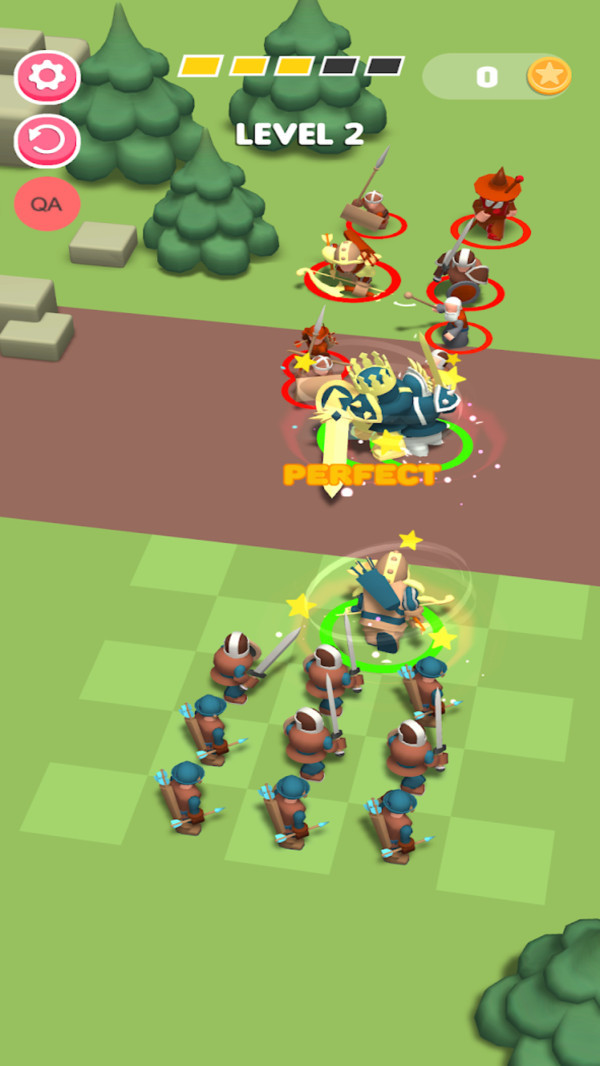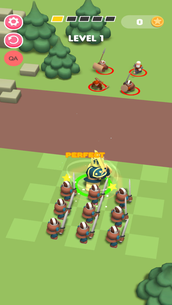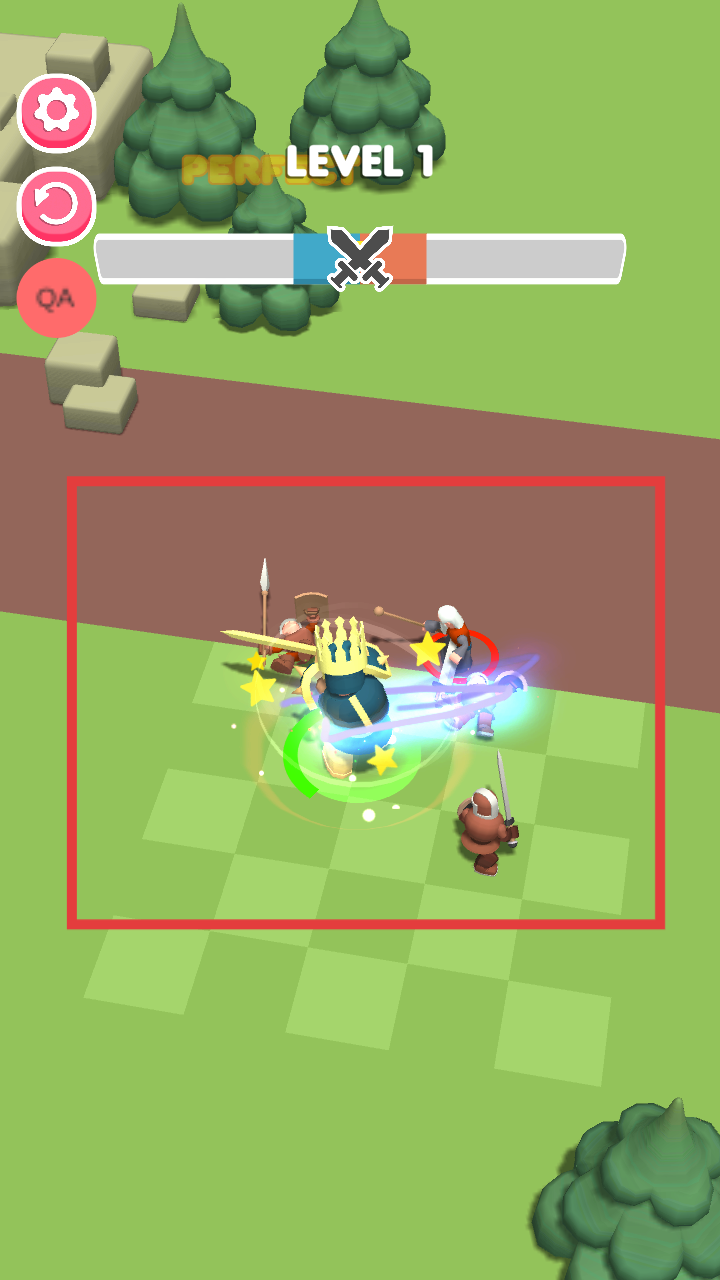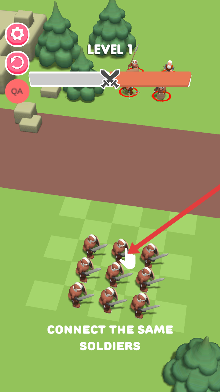 1、LEVEL-1开局,按提示【CONNECT THE SAME SOLDIERS】,连接相同士兵合成,提升战力,准备迎战上方敌人。