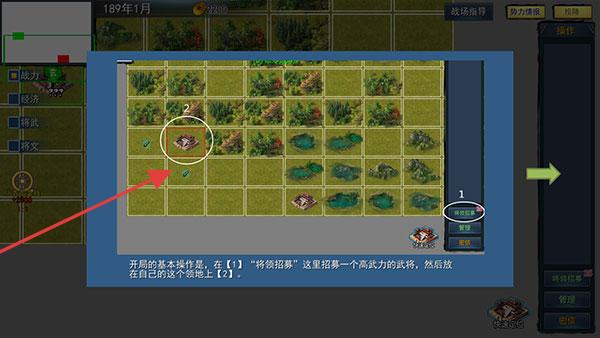 2、战役开局的基本操作是,在【将领招募】这里招募一个高武力的武将,然后放在自己的这个【领地】上。