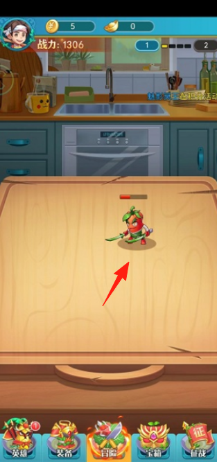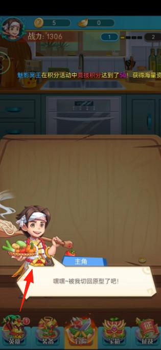 1、点击主角(红箭头),查看战力(1306),进入厨房场景,领取提示(切回原型),解锁英雄装备功能(下方)。