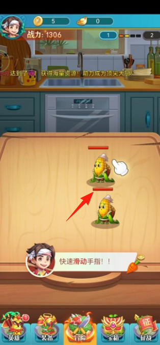 2、在案板(红箭头),快速滑动手指,合成玉米食材,触发互动,提升食材等级,积累资源(金币5),备战冒险。