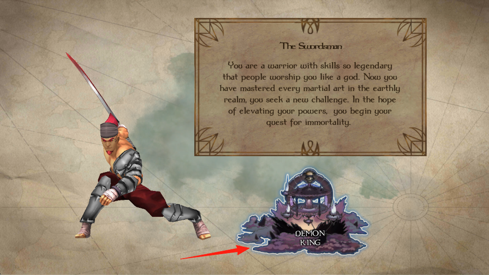 1、选“TheSwordsman”(剑士),阅读背景(追求不朽),点击“DEMONKING”(红箭头),进入魔王关卡,开启挑战。