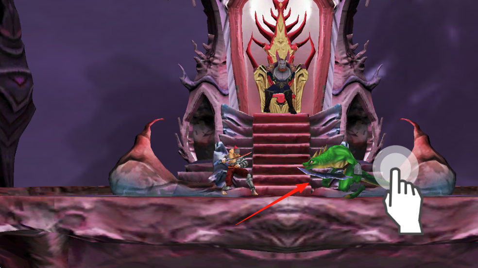 2、在魔王殿(红箭头),遇到绿龙怪,点击攻击键(手型标识),触发近战,消耗怪物血量,注意躲避技能。