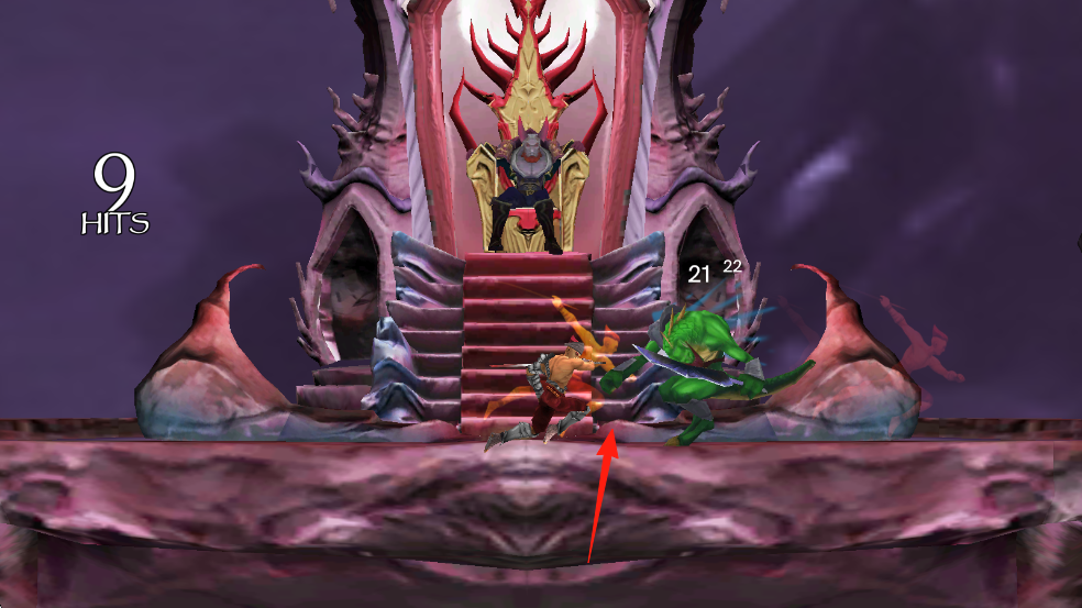 3、战斗中(红箭头),连续攻击(9HITS),触发连招,击败绿龙,积累combo,挑战最终BOSS(王座角色),推进剧情。