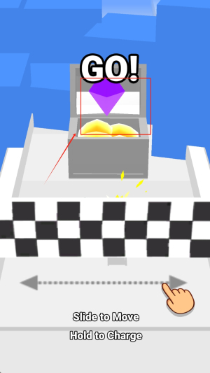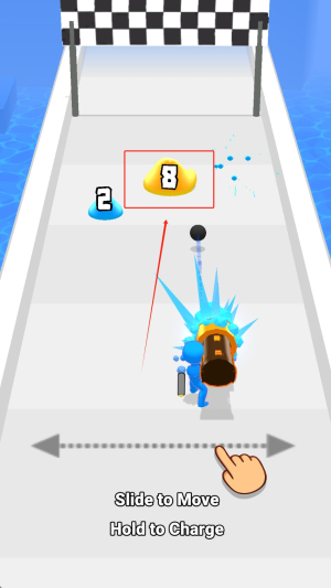 1、游戏开始时滑动屏幕控制角色在黑白格赛道上移动,注意收集标有"8"和"2"的分数道具,靠近炮筒时按住蓄力准备发射。