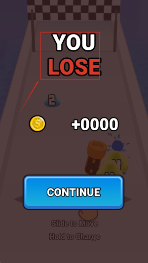 3、若挑战失败会显示"YOU LOSE"界面,查看获得的金币奖励数量,点击"CONTINUE"按钮可消耗金币立即复活继续游戏。