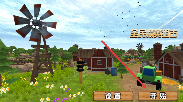 1、进入游戏的主界面,通过点击【开始】,进入《全民精英狙击》游戏流程,农场场景开启射击冒险。