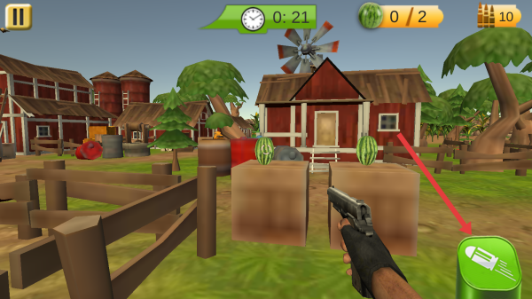 3、第1关战斗中,操控枪械射击农场目标(西瓜),留意时间(0:21)、收集数量(0/2),点右侧绿色技能补充弹药,完成挑战。