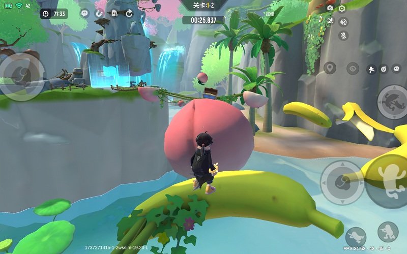 2、借助巨型香蕉道具跨越水域,观察水果、藤蔓等互动元素,规划行进路径。