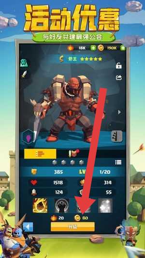 1、在英雄界面,消耗金币(80)和材料,点击【升级】,提升“斧王等级,增强属性(攻击、生命),强化战力。