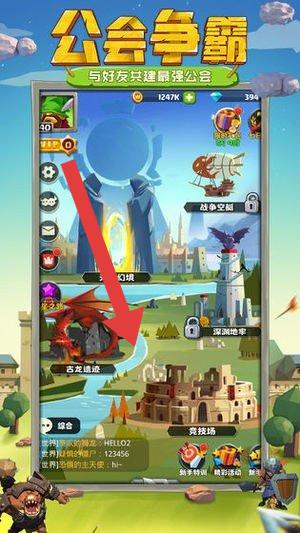 2、进入公会场景,选“古龙遗迹”玩法,与公会成员组队,挑战副本,获取公会贡献、稀有道具,推进公会建设。