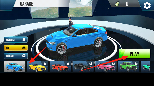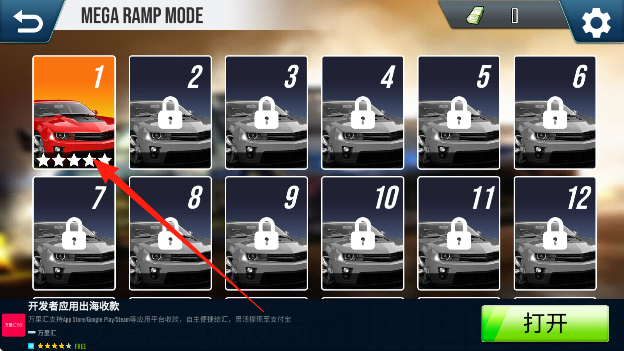 1、进入游戏从车库选一辆超级跑车,驶入首个充满跳跃坡道的关卡,开启特技竞速挑战。