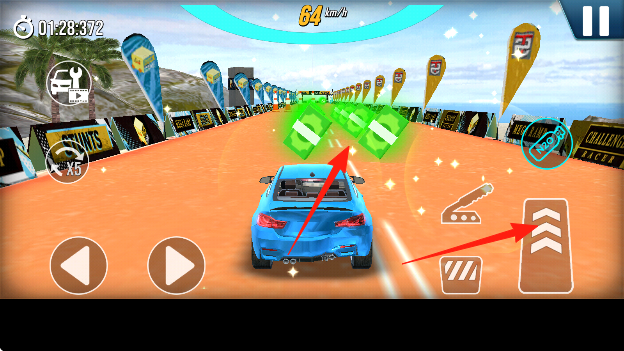 3、特技竞速玩法:融合竞速与特技元素,玩家需驾驶跑车完成跳跃、翻转等动作,体验刺激的极限驾驶乐趣。