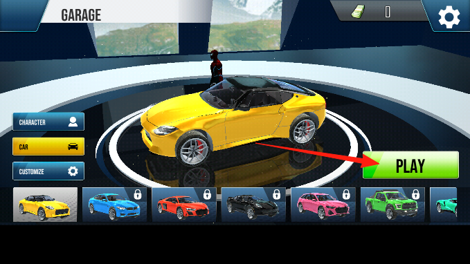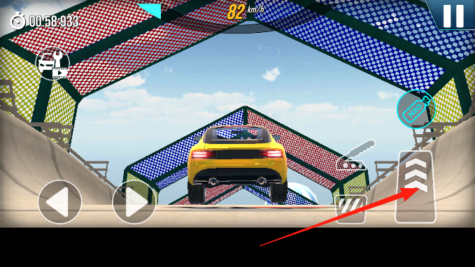 1、进入游戏在车库选辆适合高空跳跃的车辆,驶入首个架设在城市上空的巨型坡道关卡。
