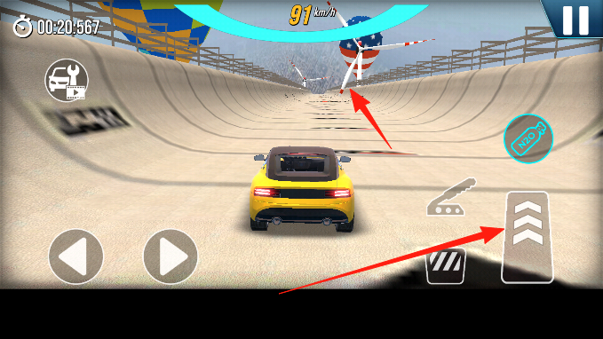 2、驾驶时在坡道加速冲刺,把握时机腾空跃起,在空中躲避旋转障碍并调整车身姿态。