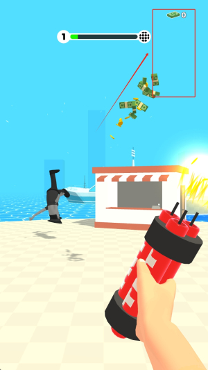 1、在海滩场景中瞄准目标投掷红色炸药包,爆炸后迅速收集散落的金币,注意观察左上角生命值避免被爆炸波及。