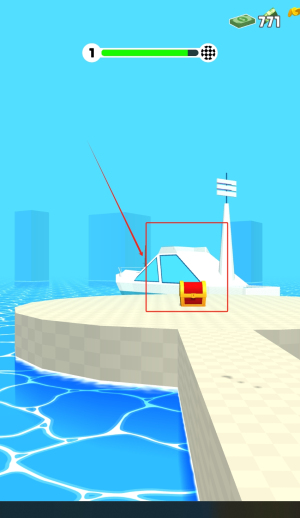 3、驾驶船只抵达码头后,调查红色框标记的神秘物体,按照任务指引解锁新的爆炸物或特殊能力。