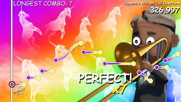 2、双指协同演奏:进入界面后,用一根手指点击控制长号发声,同时另一根手指滑动调节音高,将音高移动到准确音域部位,跟随节奏完成整首曲目的演奏。
