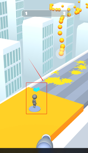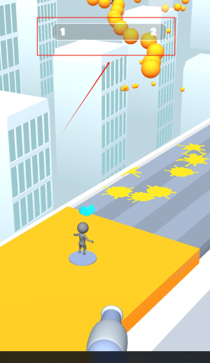 1、在城市关卡中操控炮台调整发射角度,瞄准上方标有数字1、2的彩色球体框,将角色精准发射至目标区域完成收集。