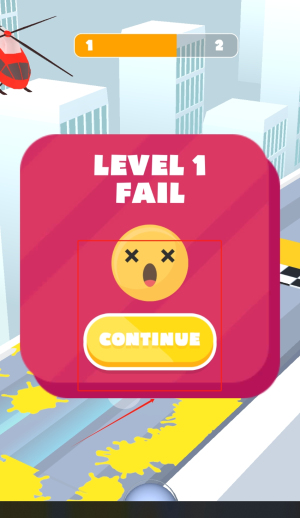 3、若挑战失败会显示"LEVEL 1 FAIL"界面,查看当前得分情况,点击"CONTINUE"按钮消耗复活机会继续当前关卡。