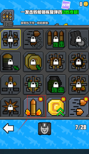 1、在武器库界面选择画框标记的"反弹"技能武器,该武器击毁目标后可自动恢复弹药,冷却时间为2秒,适合持续作战。