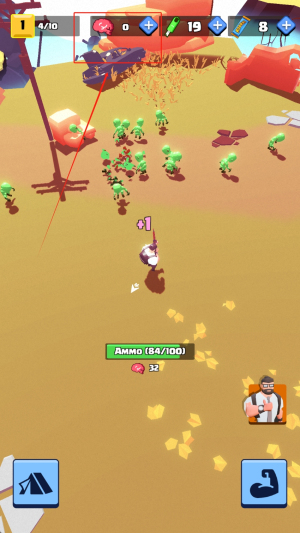 1、在4/10关卡中操控角色移动射击,注意上方AMMO(84/100)弹药量,优先消灭红框标记的绿色敌人获取+1金币奖励。