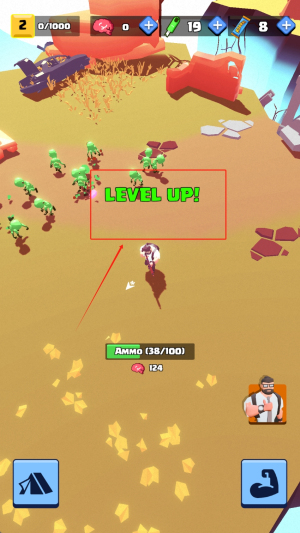 2、当角色升级出现LEVEL UP提示时,立即查看124点血量状态,利用SMASH技能清理周围敌人补充38/100弹药。