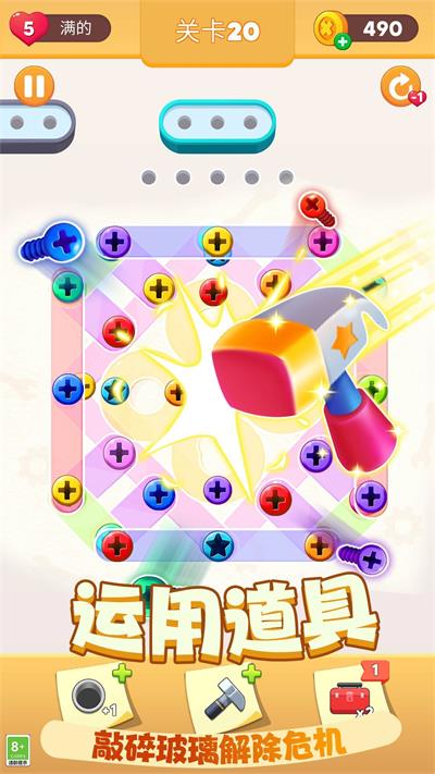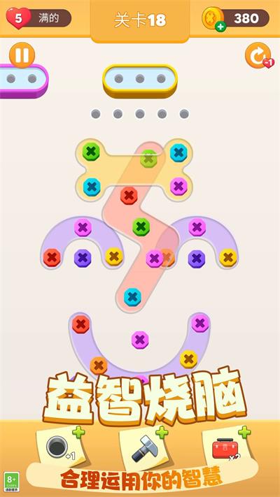 2、关卡设计充满巧思,从简单的螺丝排列到复杂的多层结构,每个新关卡都会引入独特的机关装置,如传送带、压力板等,让消除过程充满策略性。