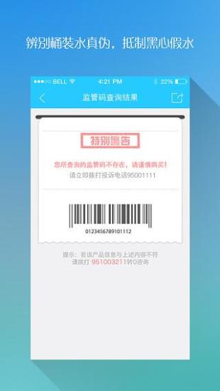 订购桶装水后,让送水工人留下桶口的防伪标识,然后打开“水卫士”,对准条形码,轻轻一扫,你就能查询到桶装水的品牌信息、生产日期、生产厂家以及其他认证信息。如果条形码破裂无法扫描,你还可以通过手动输入“电子监管码”进行查询!从此以后,你再也不用担心喝到假水!