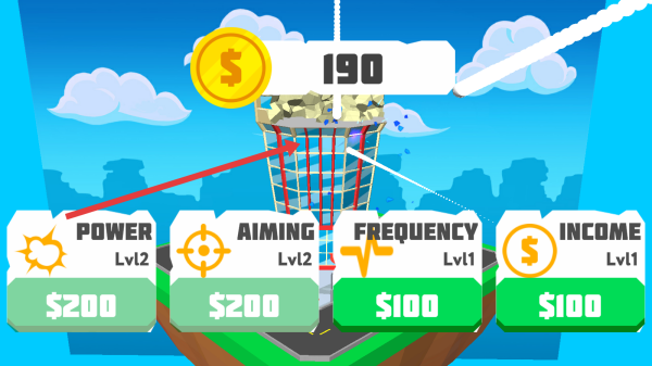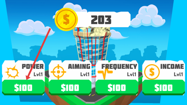 1、消耗金币(如100),升级【POWER】属性(Lv1→Lv2),提升破坏建筑的伤害,加快通关进度。