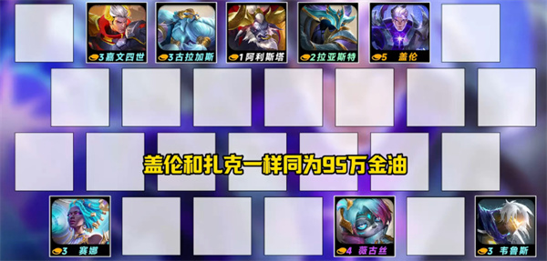 1、以5费英雄盖伦为核心,搭配其他英雄(如3费嘉文四世、5费古拉加斯等)组成阵容,盖伦作“95万金油”,适配多种体系。