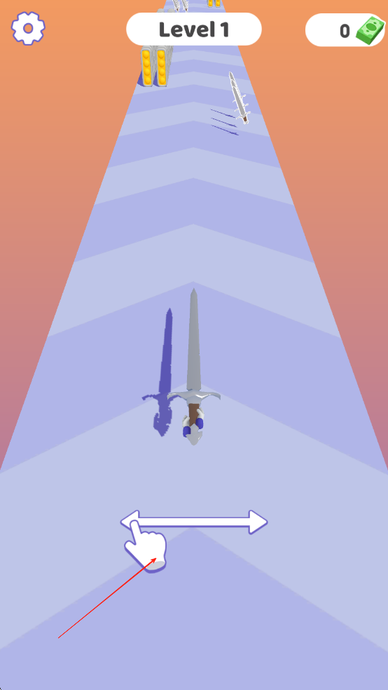 1、进入游戏后操控长剑在赛道前进,滑动屏幕左右移动,点击屏幕挥舞长剑切割前方障碍物。
