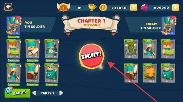 1、在【CHAPTERMISSION】界面,搭配己方锡兵卡牌,点击【FIGHT!】开启战斗。