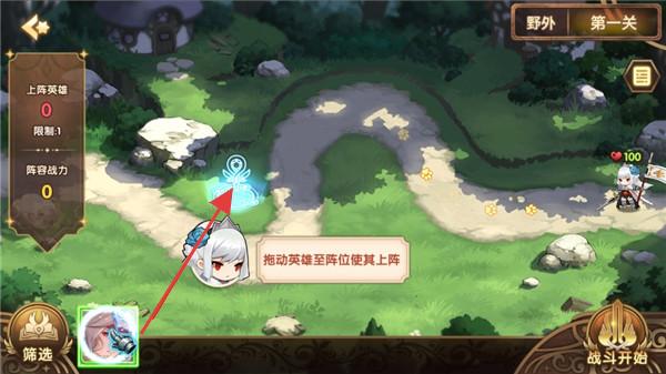 1、游戏开始,将英雄拖动到阵位上使其战斗。