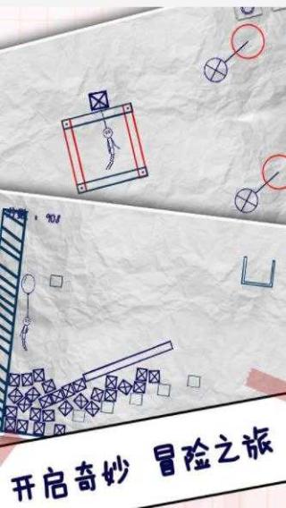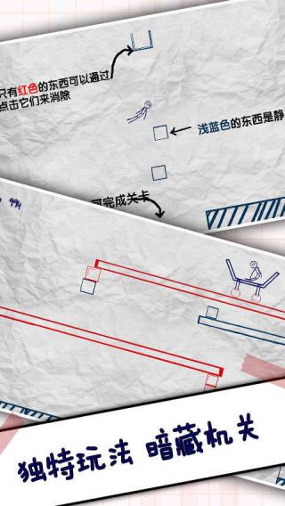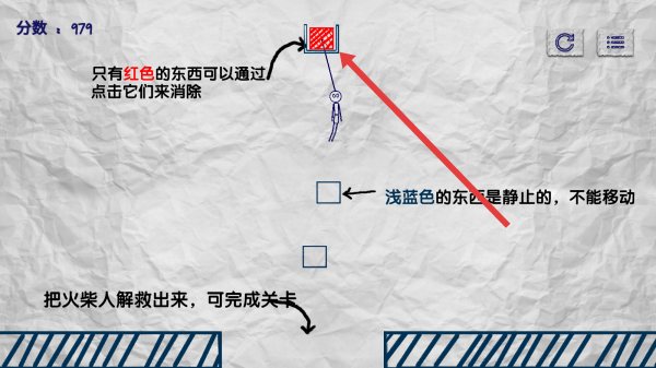 3、关卡中,点击红色方块消除,让火柴人下落,避开浅蓝色静止方块,成功解救火柴人,完成关卡。