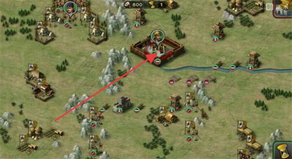 2、游戏大地图界面,可查看城池、建筑布局,红色箭头指向己方城池,用于城池管理、发展。