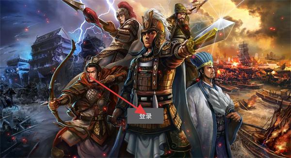 1、游戏登录界面,点击“登录”按钮进入,背景是三国武将(如持枪将领等)战斗场景。
