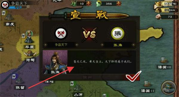 3、宣战界面,显示“宣战”对阵双方(争霸天下VS张角),张角说“苍天已死,黄天当立,天下即将属于我们”,确认后可发起战斗。