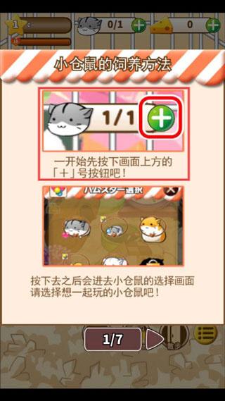 1、下载安装完成之后进入游戏,首先按下画面上方的+号按钮,然后按下去之后会进去小仓鼠的选择画面,请选择想一起玩的小仓鼠。