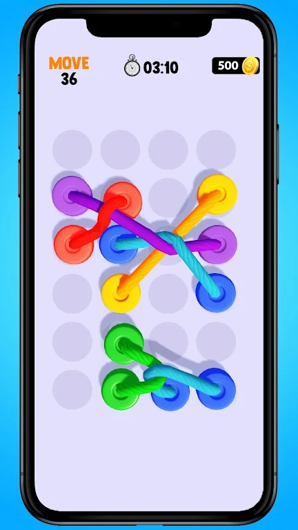 1、视觉极简国度:现代简约风格的场景与绳索设计,细腻的光影效果与绚丽的解绳特效,随关卡变化的背景音乐,全方位打造极具视觉冲击力的绳结世界。