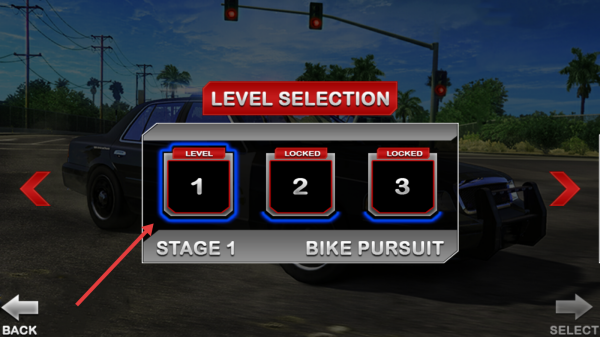 2、选【LEVEL1】(STAGE1),开启摩托追捕(BIKE PURSUIT )关卡。