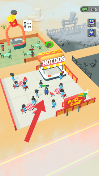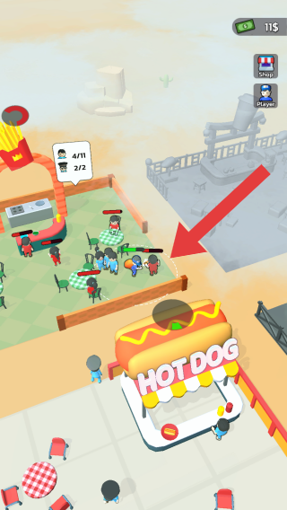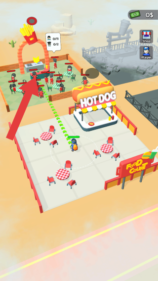 2、玩家可经营餐食区域(如热狗店等),进行餐车相关的建造、合成与经营玩法,体验美食主题的模拟经营乐趣。
